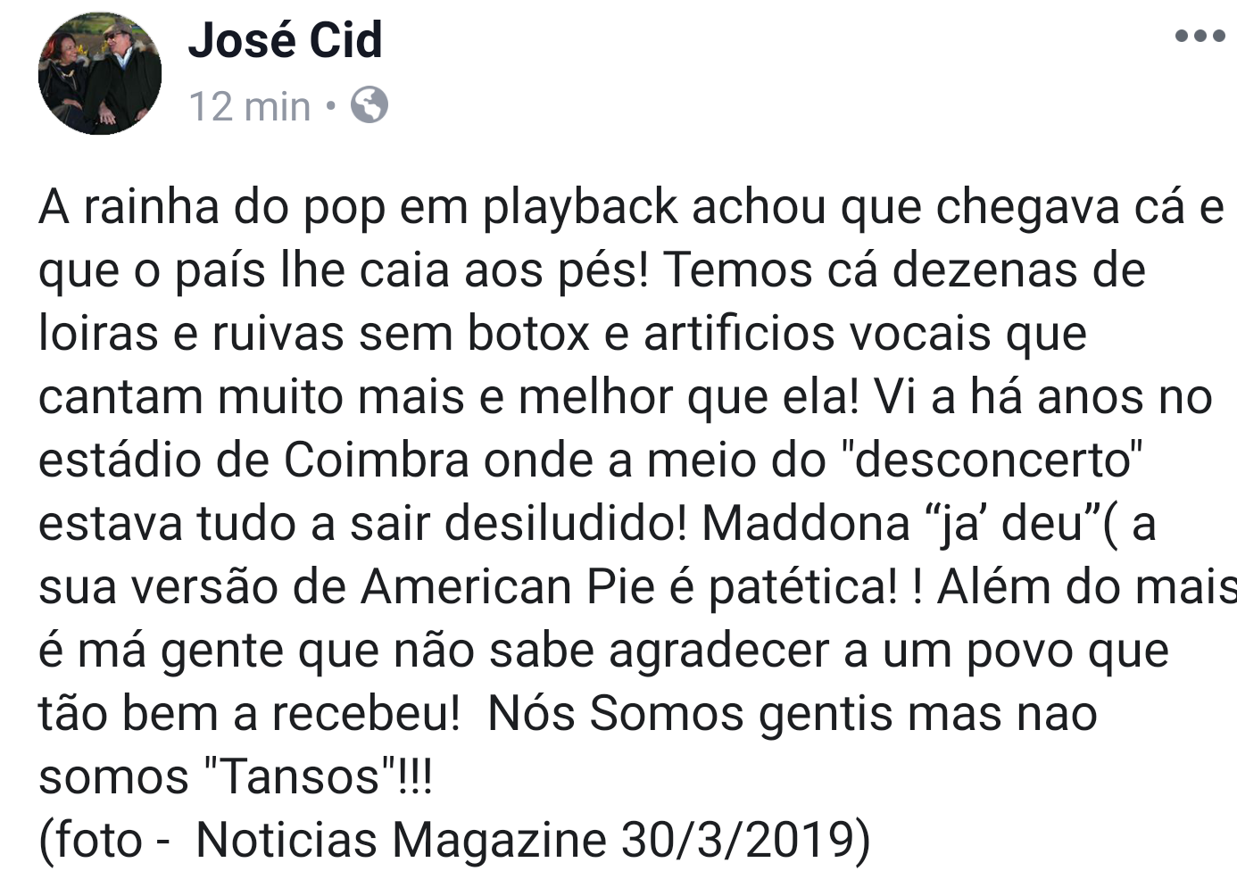Depois de Madonna ter criticado Portugal por o presidente da Câmara de Sintra não ter permitido a entrada de um cavalo num palácio para a gravação de um videoclipe, o cantor José Cid decidiu falar do caso há minutos: