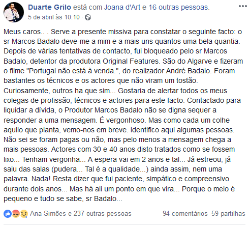 A denúncia da falta de pagamento a alguns técnicos e a alguns actores é feita por Duarte Grilo: