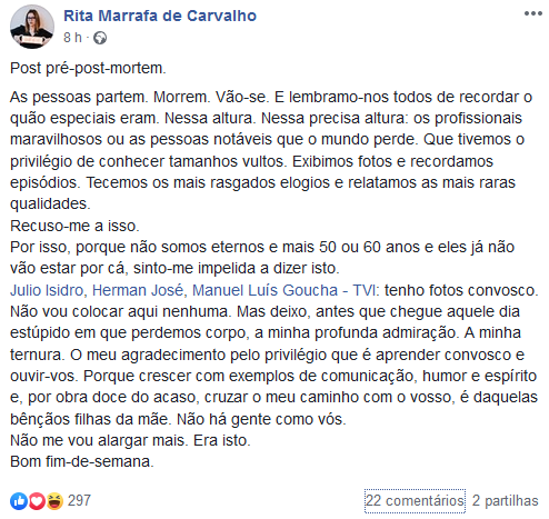 A jornalista da RTP decidiu enviar uma mensagem para Júlio Isidro, Manuel Luís Goucha e Herman José.
