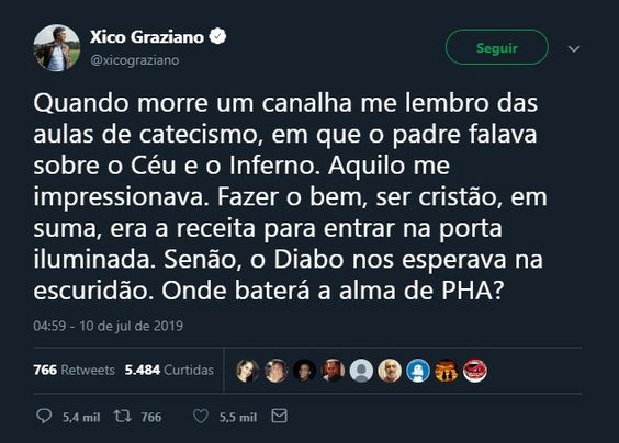 Quando morre um canalha me lembro das aulas de catecismo, em que o padre falava sobre o Céu e o Inferno. Aquilo me impressionava. Fazer o bem, ser cristão, em suma, era a receita para entrar na porta iluminada. Senão, o Diabo nos esperava na escuridão. Onde baterá a alma de PauloHenriqueAmorim?