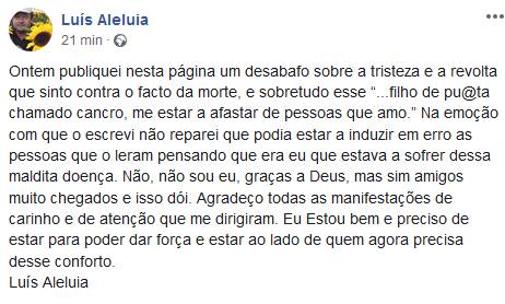 « Atenção, o Luís Aleluia está bem, foi apenas um desabafo em relação à morte recente de um amigo que partiu subitamente com uma leucemia Aguda.