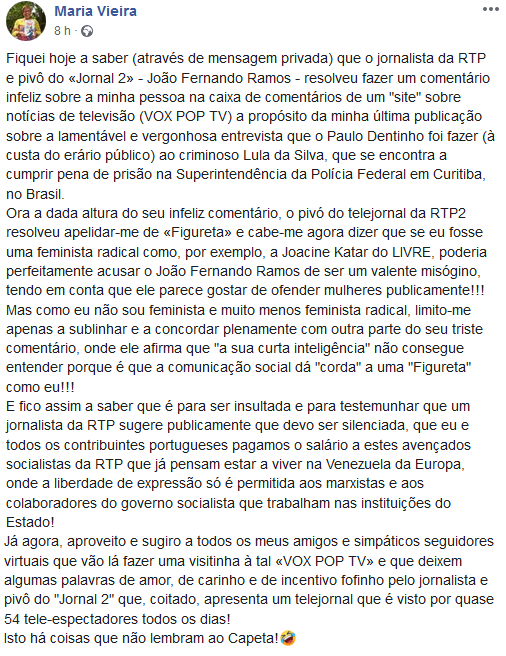 ” Fiquei hoje a saber (através de mensagem privada) que o jornalista da RTP e pivô do «Jornal 2» – João Fernando Ramos – resolveu fazer um comentário infeliz sobre a minha pessoa na caixa de comentários de um “site” sobre notícias de televisão (VOX POP TV) a propósito da minha última publicação sobre a lamentável e vergonhosa entrevista que o Paulo Dentinho foi fazer (à custa do erário público) ao criminoso Lula da Silva, que se encontra a cumprir pena de prisão na Superintendência da Polícia Federal em Curitiba, no Brasil.