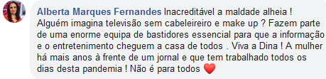 A jornalista da RTP, Alberta Marques Fernandes, decidiu sair em defesa da sua colega Dina Aguiar, depois de vários profissionais da área da beleza e alguns seguidores da jornalista que apresenta o Portugal em Direto, a terem criticado por ter publicado várias fotografias onde aparecia a ser maquilhada no estúdio da RTP.