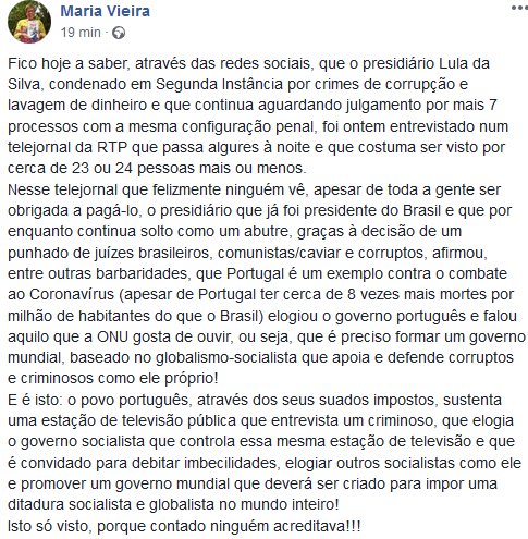 A actriz diz que só hoje soube de uma entrevista que a RTP fez, em exclusivo, ao ex-presidente do Brasil Lula da Silva.