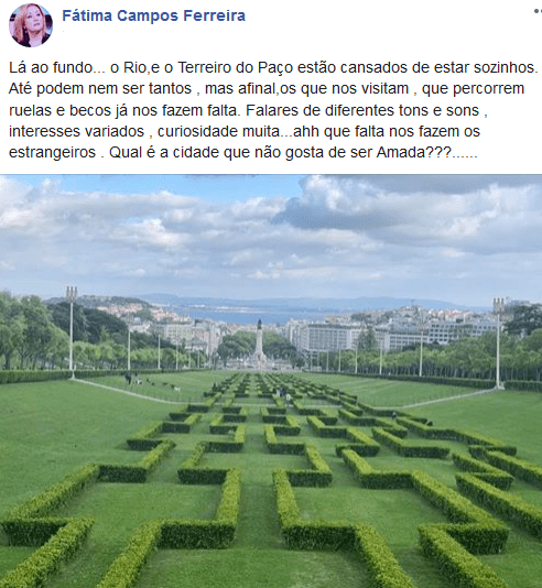 “Lá ao fundo… o Rio,e o Terreiro do Paço estão cansados de estar sozinhos. Até podem nem ser tantos , mas afinal,os que nos visitam , que percorrem ruelas e becos já nos fazem falta. Falares de diferentes tons e sons , interesses variados , curiosidade muita…ahh que falta nos fazem os estrangeiros . Qual é a cidade que não gosta de ser Amada???……”, escreveu