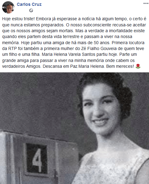 Num texto emotivo que escreveu na sua página de facebook, Carlos Cruz presta homenagem a Maria Helena Varela Santos que morreu hoje, domingo, aos 86 anos de idade, vítima de doença prolongada: