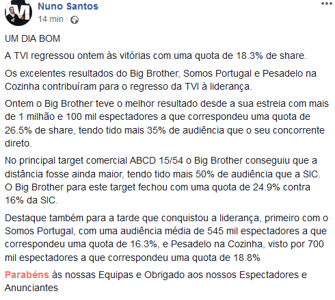 A TVI fechou o dia com um total diário de 18,3%, enquanto o total diário da SIC foi de 18,2%. Uma diferença muito pequena mas que deu à TVI a possibilidade de cantar vitória.