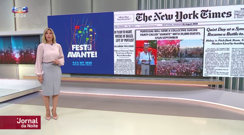 A emissão desta terça-feira, dia 1 de setembro, do “Jornal da Noite”, da SIC, está a dar que falar nas redes sociais. Durante o noticiário da SIC foi exibida uma capa falsa do jornal norte-americano New York Times, onde a Festa do Avante! fazia manchete.