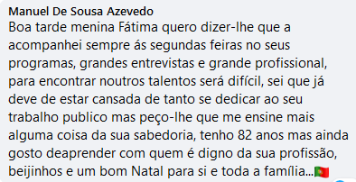 Foi através da página de facebook da VOX POP TV, que um leitor decidiu escrever uma emotiva mensagem à jornalista da RTP, Fátima Campos Ferreira:
