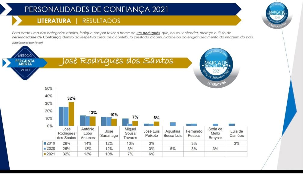 José Rodrigues dos Santos subiu a percentagem de votos face ao estudo do ano anterior na categoria de escritor, registando a marca de 32% nas preferências literárias dos portugueses.