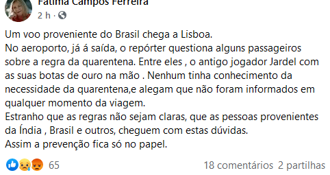 “Um voo proveniente do Brasil chega a Lisboa. No aeroporto, já á saída, o repórter questiona alguns passageiros sobre a regra da quarentena. Entre eles , o antigo jogador Jardel com as suas botas de ouro na mão . Nenhum tinha conhecimento da necessidade da quarentena,e alegam que não foram informados em qualquer momento da viagem. Estranho que as regras não sejam claras, que as pessoas provenientes da Índia , Brasil e outros, cheguem com estas dúvidas. Assim a prevenção fica só no papel.”, escreveu a jornalista