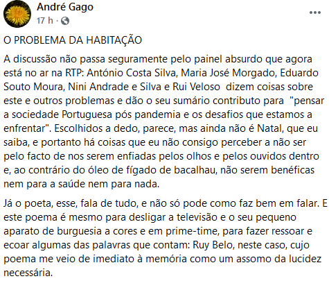 Já o poeta, esse, fala de tudo, e não só pode como faz bem em falar. E este poema é mesmo para desligar a televisão e o seu pequeno aparato de burguesia a cores e em prime-time, para fazer ressoar e ecoar algumas das palavras que contam: Ruy Belo, neste caso, cujo poema me veio de imediato à memória como um assomo da lucidez necessária.