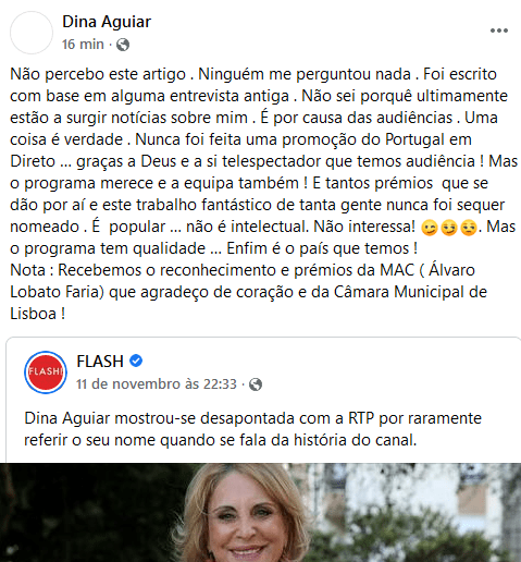 A jornalista da RTP estranha o facto de, nos últimos dias, estar a ser notícia em vários sites. Por isso mesmo, com a frontalidade que lhe é conhecida, fez questão de falar sobre um artigo, neste caso do site “Flash!”, onde é escrito que Dina Aguiar está triste e desapontada com a RTP: