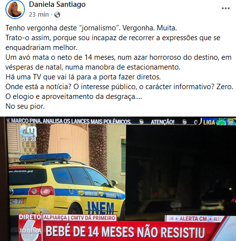 “Tenho vergonha deste “jornalismo”. Vergonha. Muita.Trato-o assim, porque sou incapaz de recorrer a expressões que se enquadrariam melhor. Um avó mata o neto de 14 meses, num azar horroroso do destino, em vésperas de natal, numa manobra de estacionamento. Há uma TV que vai lá para a porta fazer diretos. Onde está a notícia? O interesse público, o carácter informativo? Zero. O elogio e aproveitamento da desgraça…. No seu pior.”, escreveu
