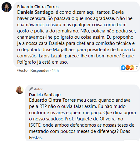 A jornalista da RTP, Daniela Santiago, fez ontem, sábado, um desabafo sobre uma reportagem do canal CMTV. Muitos foram os seguidores da jornalista que concordaram com a sua visão e desabafo. No entanto, o crítico de televisão e comentador da CMTV, Eduardo Cintra Torres, entrou no debate de ideias e a conversa acabou num bate-boca de acusações entre a jornalista da estação pública e o comentador da CMTV.