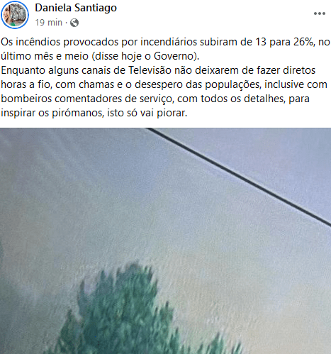 “Os incêndios provocados por incendiários subiram de 13 para 26%, no último mês e meio (disse hoje o Governo). Enquanto alguns canais de Televisão não deixarem de fazer diretos horas a fio, com chamas e o desespero das populações, inclusive com bombeiros comentadores de serviço, com todos os detalhes, para inspirar os pirómanos, isto só vai piorar.”, escreveu Daniela Santiago